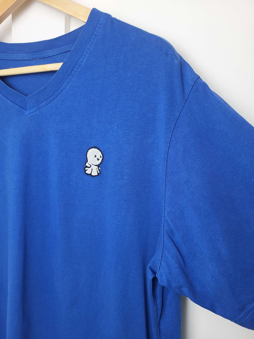 Brown Mushroom Embroidery on Blue Tshirt - Size UK M